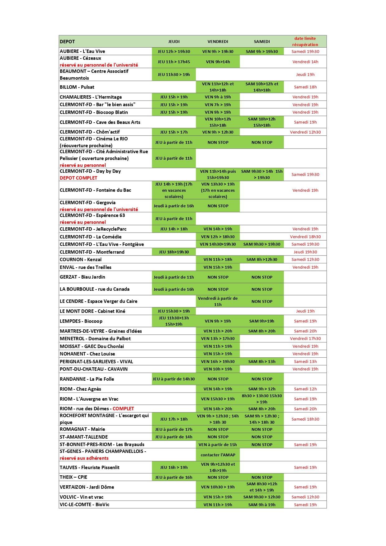 Récupération Jeudi à partir de 16h et Vendredi toute la journée